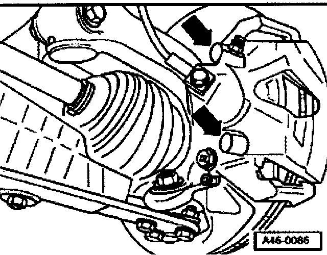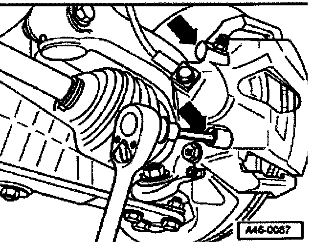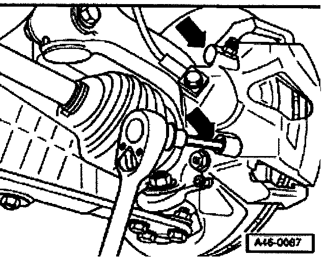^ Remove both guide pins (arrows) from brake caliper.