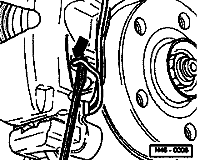^ Do not allow the caliper to hang by the brake hose. The unsupported weight can stretch and damage the hose.
