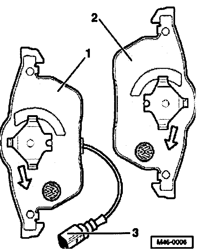 CAUTION! When installed, it is important that the arrow on the brake pad backing plate A- points downward.