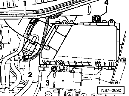 ^ Remove air intake hose -1- and connector -2- from Mass Air Flow (MAF) Sensor.