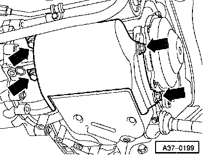 ^ Remove torque converter nuts (Qty. 3) -arrow- with special tool V175.