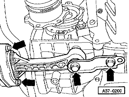 ^ Place safety support pin on oil pan and secure it to transmission housing (arrow).