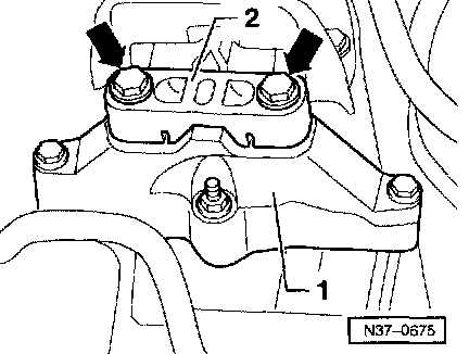 ^ Remove bolts -arrows- of left engine/transmission mount -2- from the left support -1-.