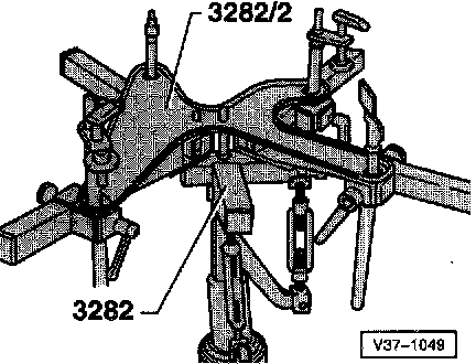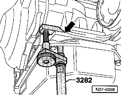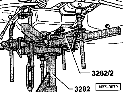 ^ Move jack VAG 1383 A with 3282 under the transmission and support it.