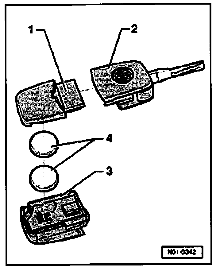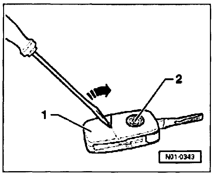- Insert a screwdriver in the slot between the transmitter unit -1- and the main key -2-