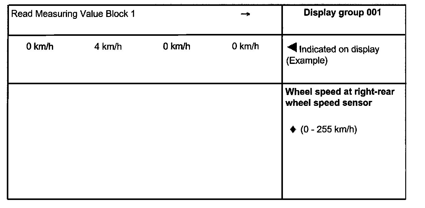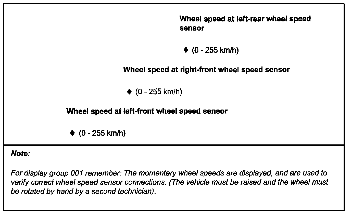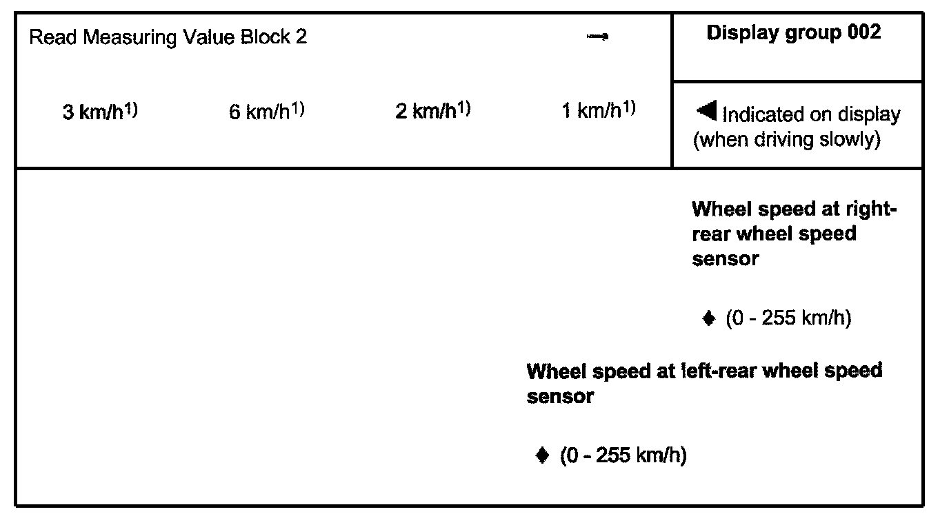 ^ The reading of measured value blocks in display group number 002 must be undertaken when driving off slowly. Then the control module -J104- will store the first usable voltage signals provided by the speed sensors and display these as a fixed value in the measured value block.
