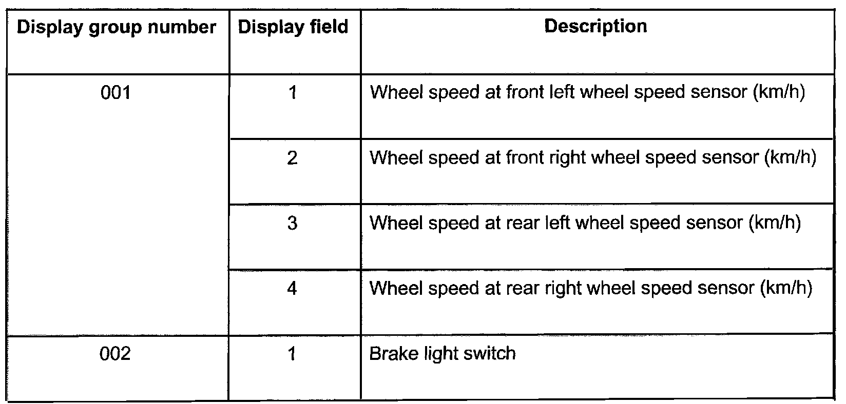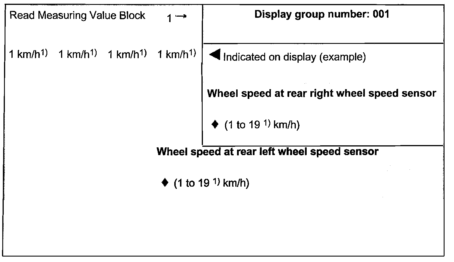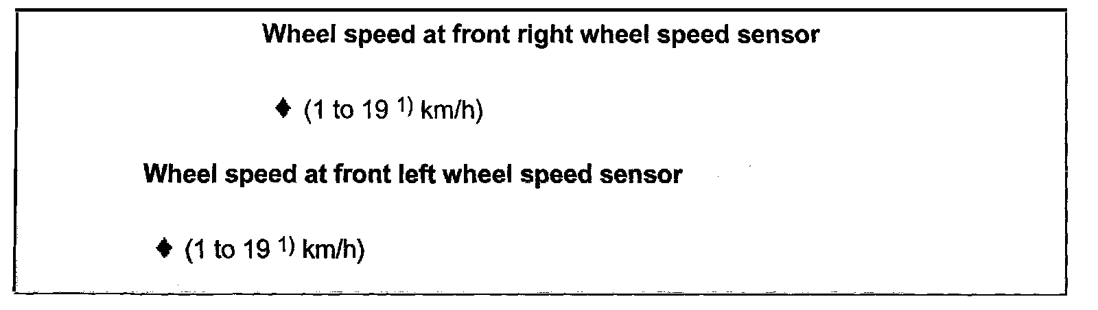 The current wheel speeds are indicated. This is useful for checking wheel speed sensor allocation by wheel. (Vehicle must be raised and a second technician must turn wheel by hand)