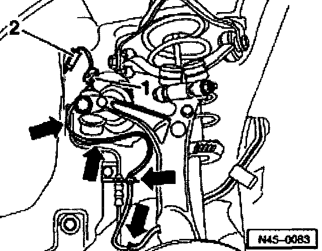 ^ Disconnect ABS wheel speed sensor wiring from retainers (arrows).