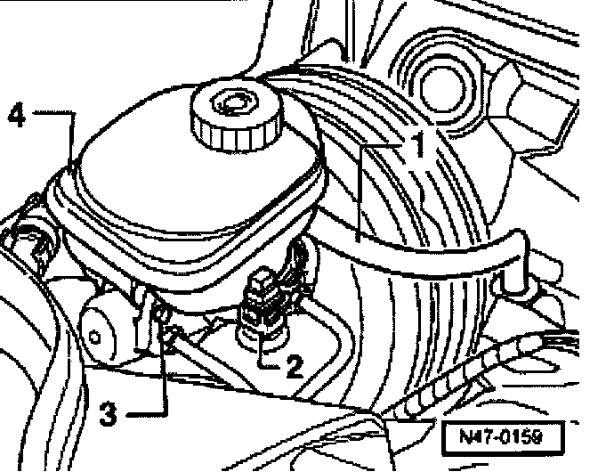 ^ Remove brake fluid reservoir -4-. To do this press down the locking tab on the reservoir and at the same time pull the brake fluid reservoir out of the sealing plugs.