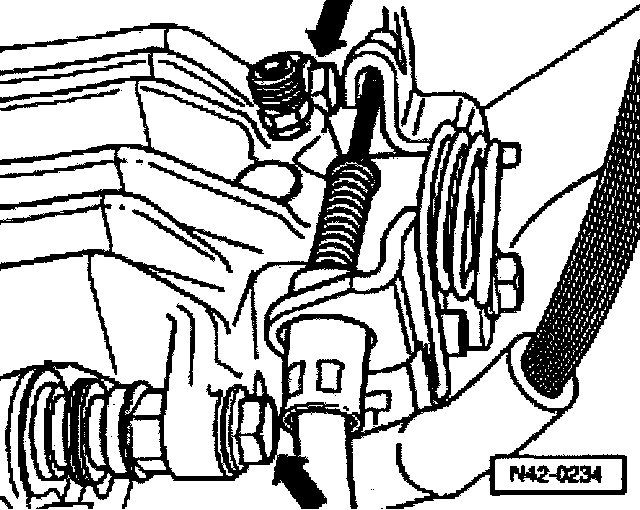 - Remove securing bolts -arrows- from brake caliper housing while counterholding on guide pins.
