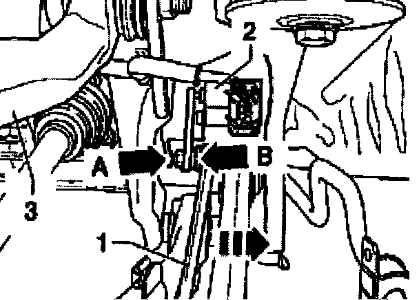 - Remove nut -arrow A- from coupling rod -1- for vehicle attitude sensor -2- while counterholding on wrench surfaces -arrow B-.