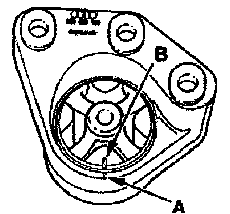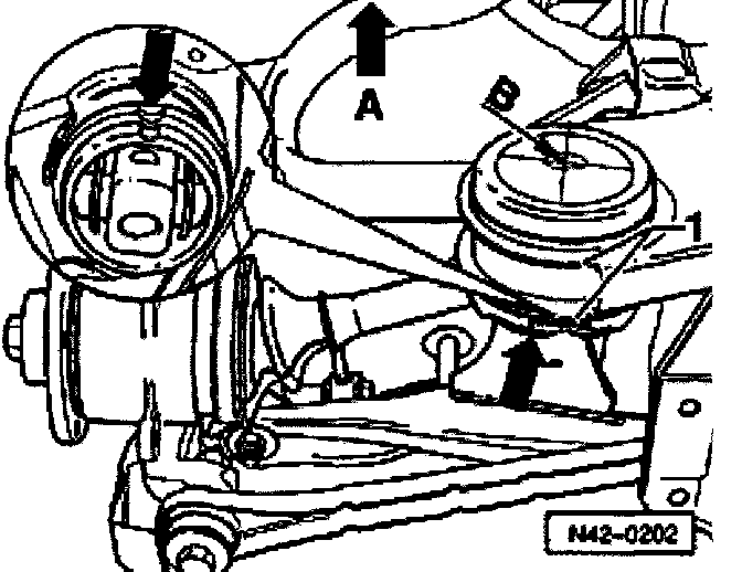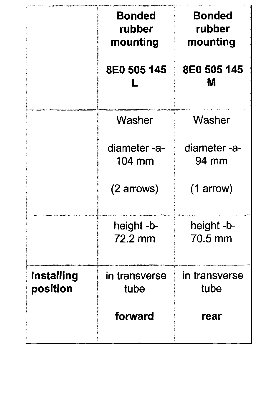 The eccentric hole -B- in bonded rubber mounting must point forward -arrow A-.