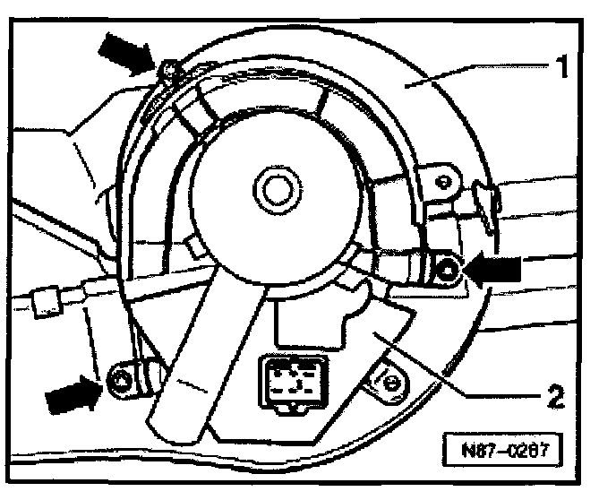 - Insert fresh air blower with blower control unit -2- into housing -1- and secure with screws -arrows-.