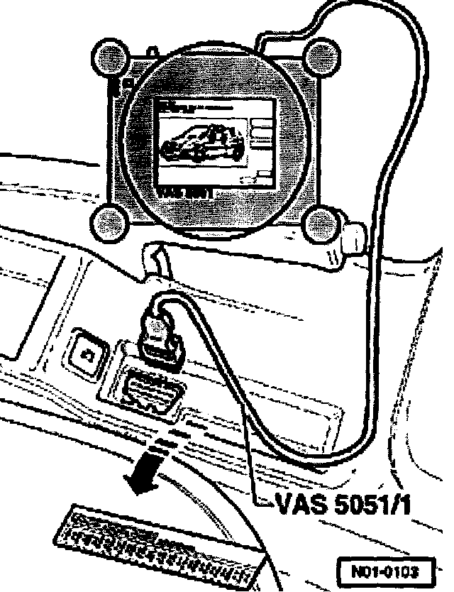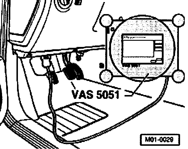 ^ Connect VAS5051 tester to Data Link Connector (DLC) using VAS5051 or VAS5051/3 diagnostic cable with ignition switched off.