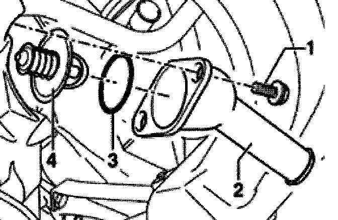 - Remove bolts -1-, connecting piece -2-, O-ring -3- and coolant thermostat -4-.