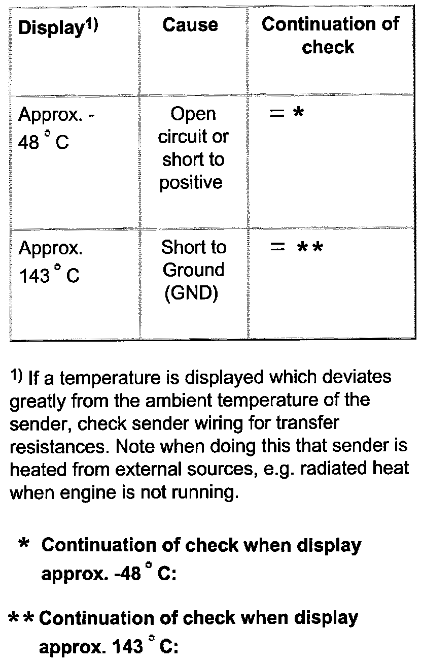 - If irregular engine running occurs in certain temperature ranges and the temperature figure does not increase without interruption, the temperature signal is temporarily interrupted and the sender must be replaced.