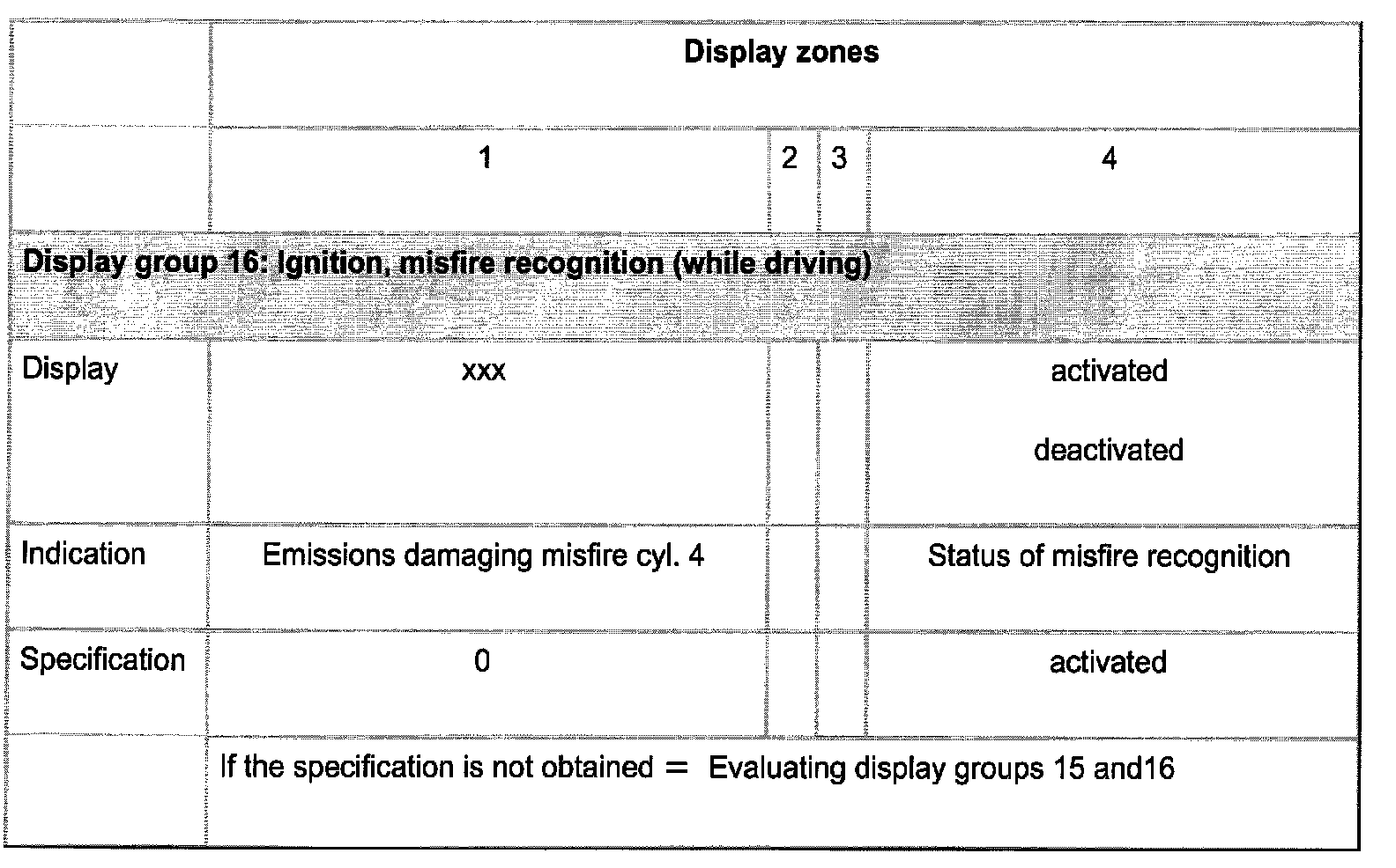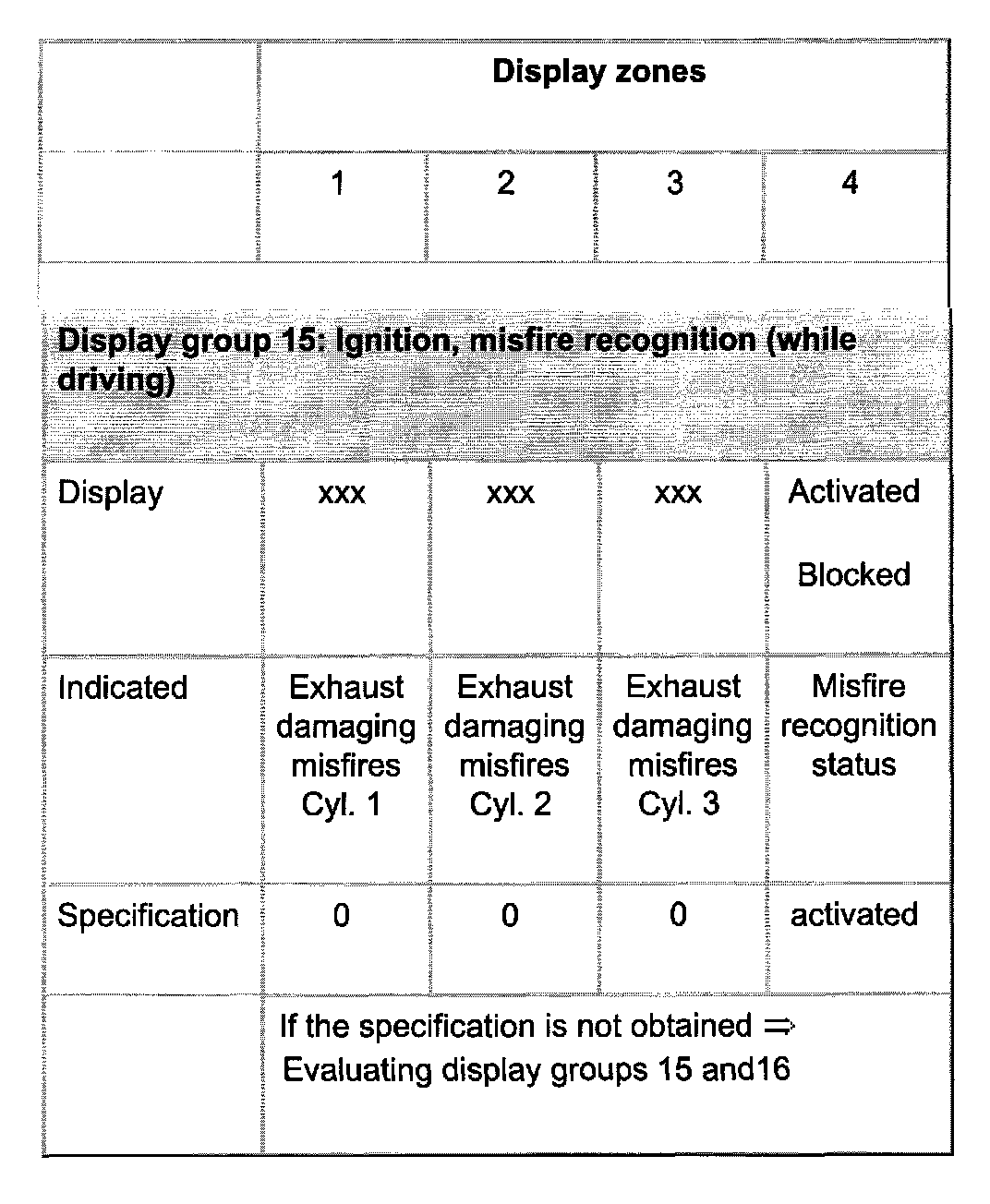 Evaluating display groups 15, display zones 1 to 3 and display group 16, display zone 1 - total number of exhaust damaging misfires Cyl. 1 to Cyl. 4