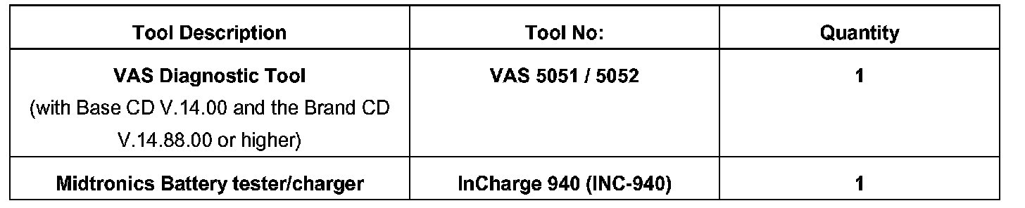 Battery MUST have minimum no-load charge of 12.5V (failure to maintain voltage during update process can lead to ECM failure) (use a Volkswagen approved Midtronics/InCharge 940 (INC-940) tester/charger to maintain battery voltage).