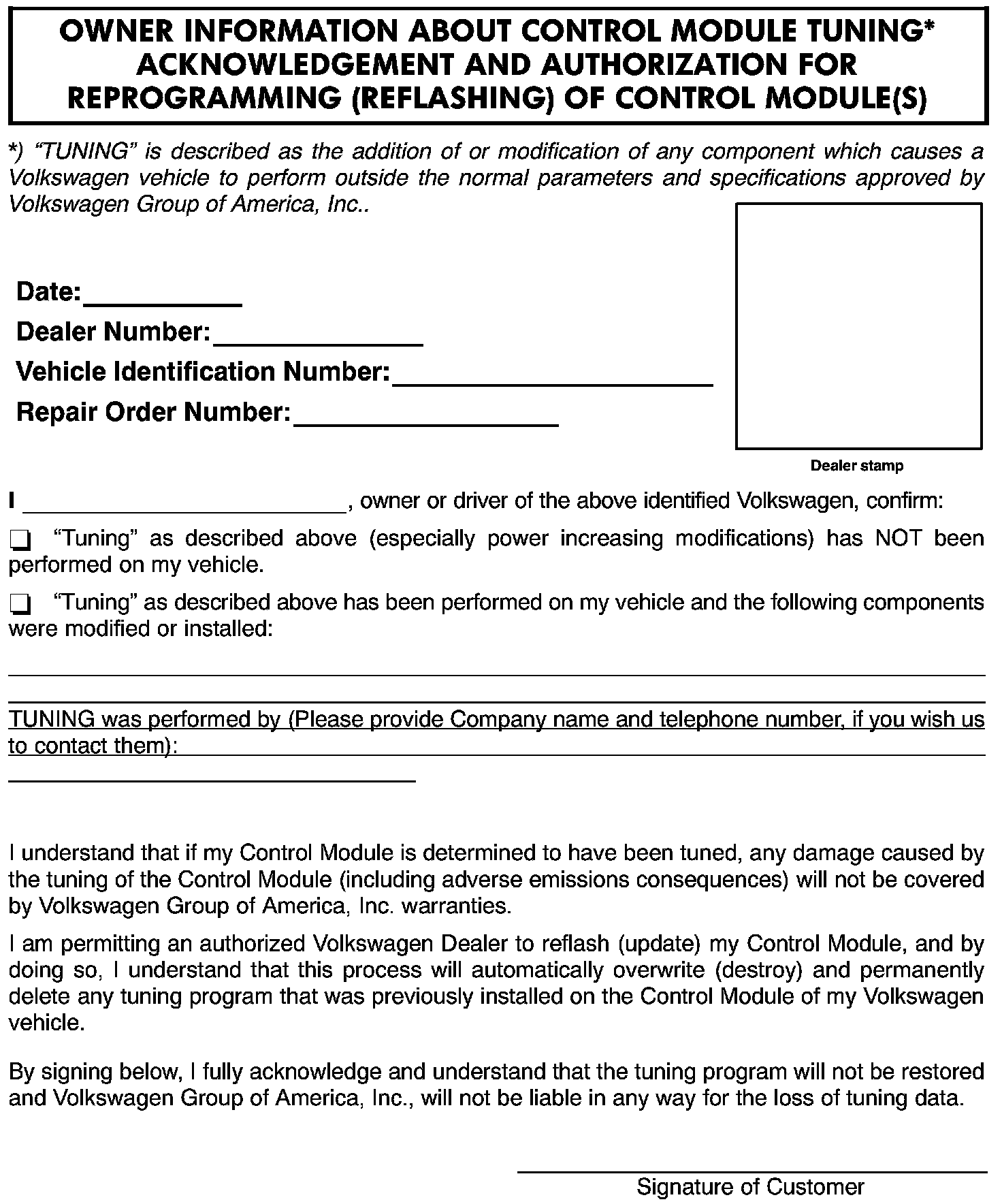 - Notify the owner any damage caused by the tuning of the ECM or TCM (including any adverse emissions consequences) will not be covered by Volkswagen Group of America warranties.