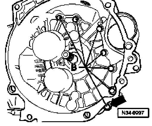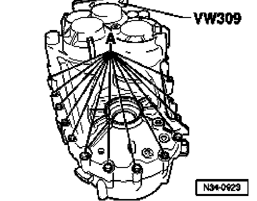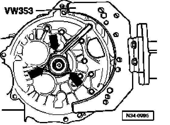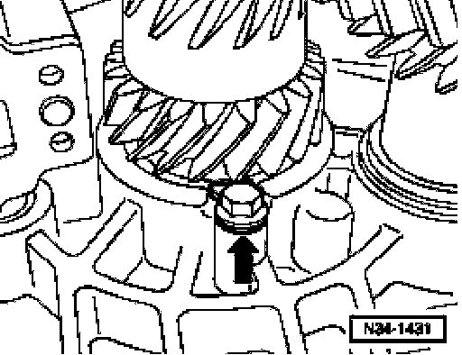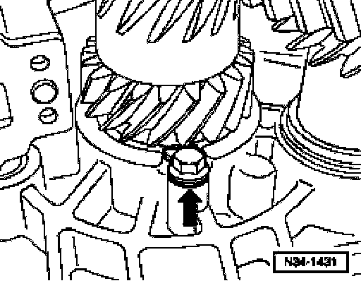 ^ Unscrew locking plate bolt -arrow- (outer race/taper roller bearing from input shaft).