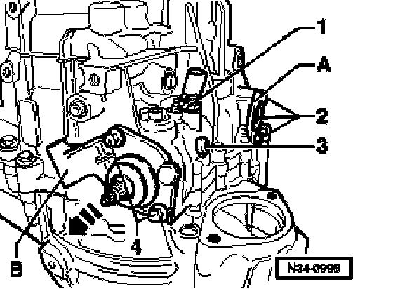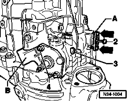 ^ Remove bolts -4- and press selector shaft cover -B- out of transmission housing.