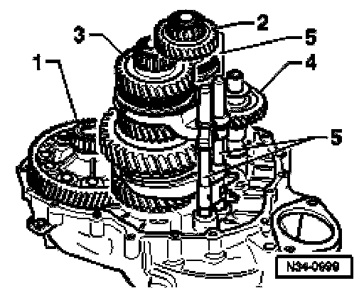 ^ With help of a second mechanic, remove differential -1-, output shafts -2- and -3-, reverse shaft -4- and selector rods -5- together from clutch housing.