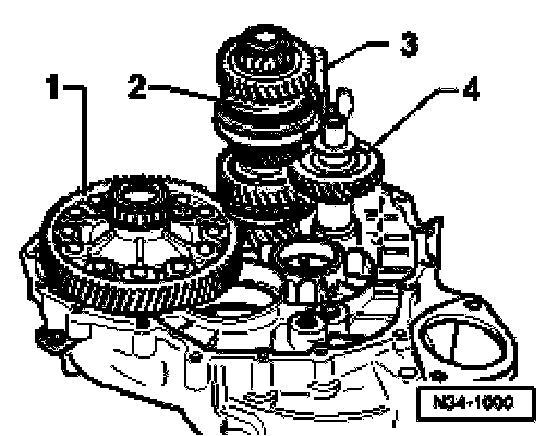 ^ Install 5th, 6th and reverse gear output shaft -2- together with reverse selector fork, 5th, 6th and reverse gear selector rod -3- and reverse shaft -4-.