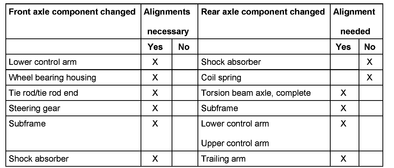 ^ Perform vehicle alignment only after 1000 - 2000 km (600 - 1200 miles) to allow suspension time to settled.