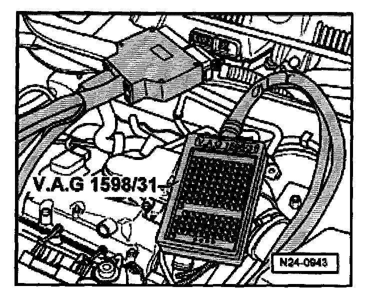 - Connect test box V.A.G 1598/31 to control module wiring harness. Engine control module remains disconnected.