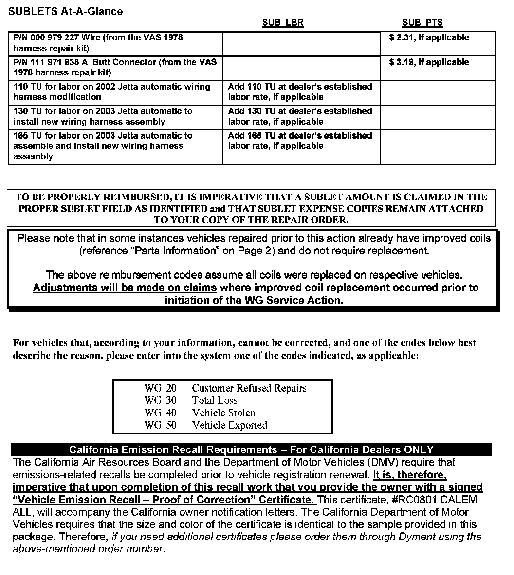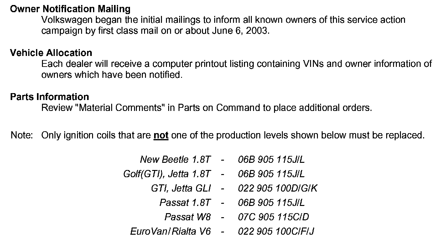 2001 - 2003 Model Year Volkswagen Vehicles Replace