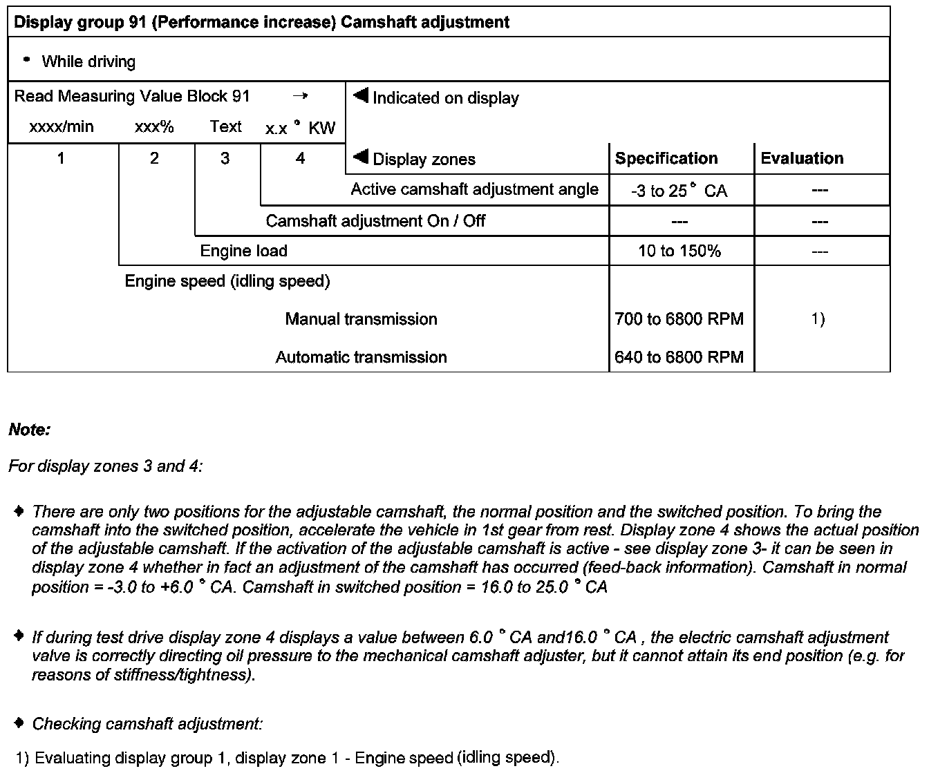 Display group 91 (Performance increase) Camshaft adjustment