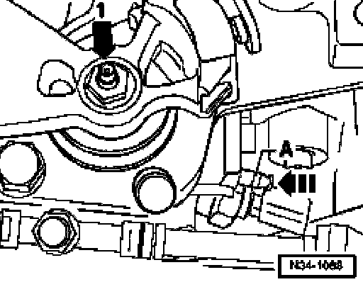 ^ While pressing selector shaft down, push locking pin -A- into transmission (direction of arrow -2-) until it engages.
