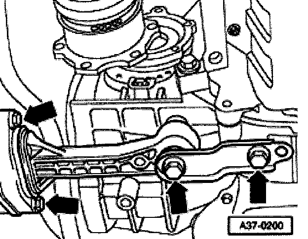 - Remove engine/transmission mount from transmission bracket (arrows) working from above.