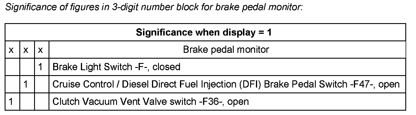 Significance of figure in 3-digit number block for brake pedal monitor.