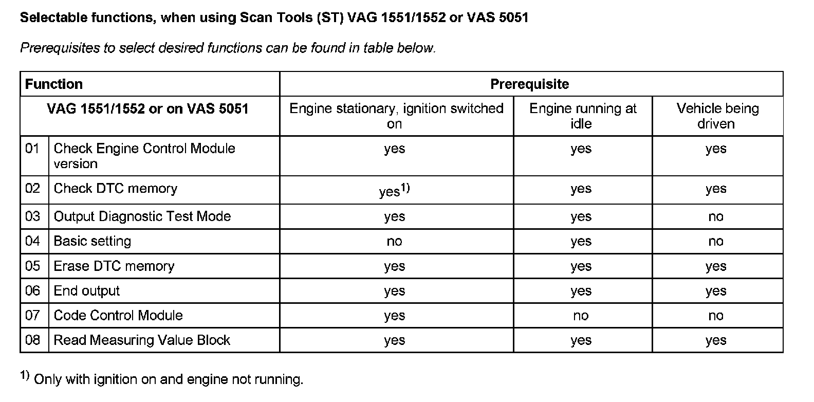 Selectable Functions, When Using Scan Tools (ST) VAG 1551/1552 Or VAS 5051