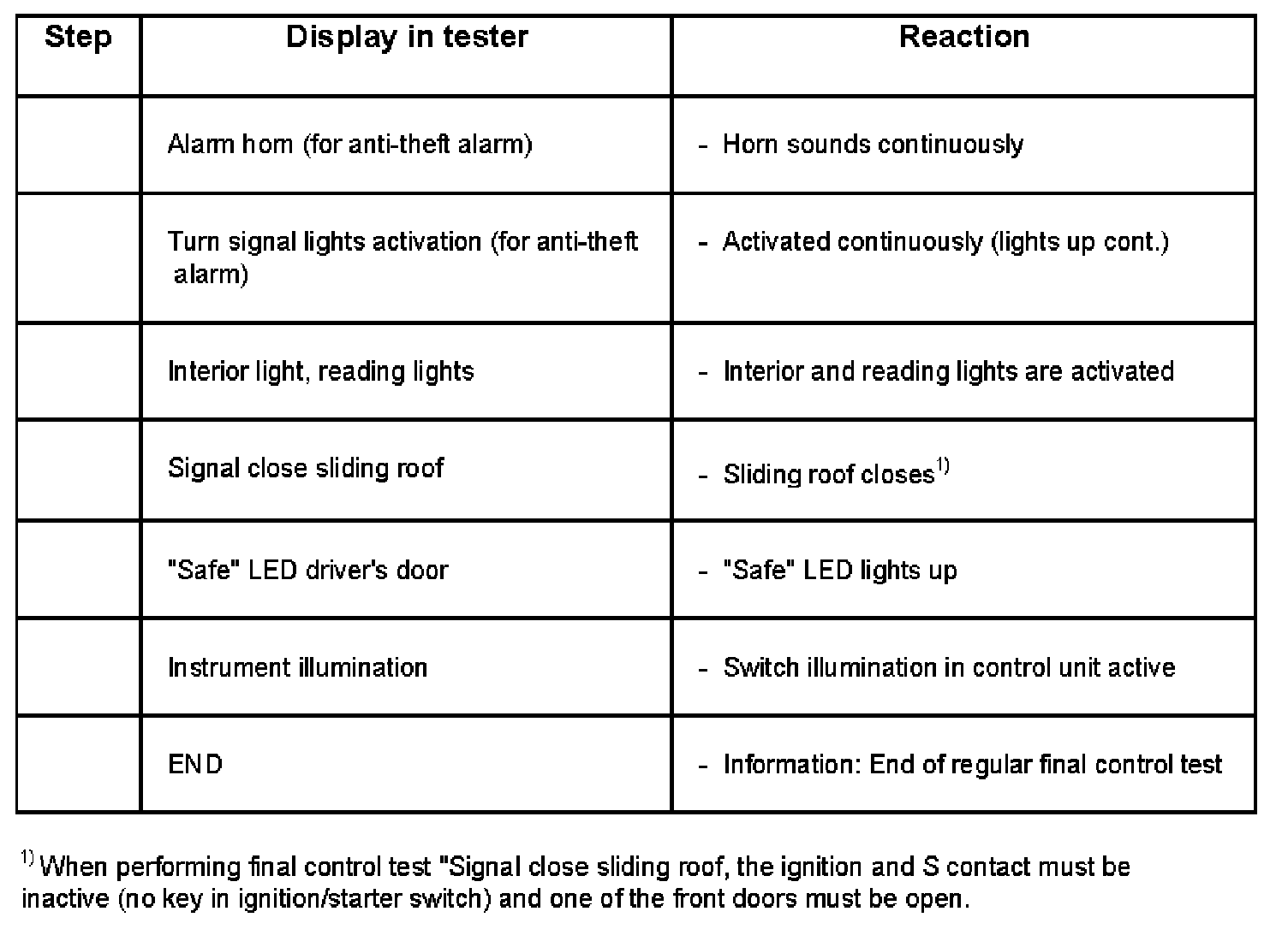 The components displayed in the Output Diagnostic Test Mode (DTM) can differ depending upon the equipment fitted to the vehicle. For example on vehicles without ATA there will be no step "1" as listed in the table below.