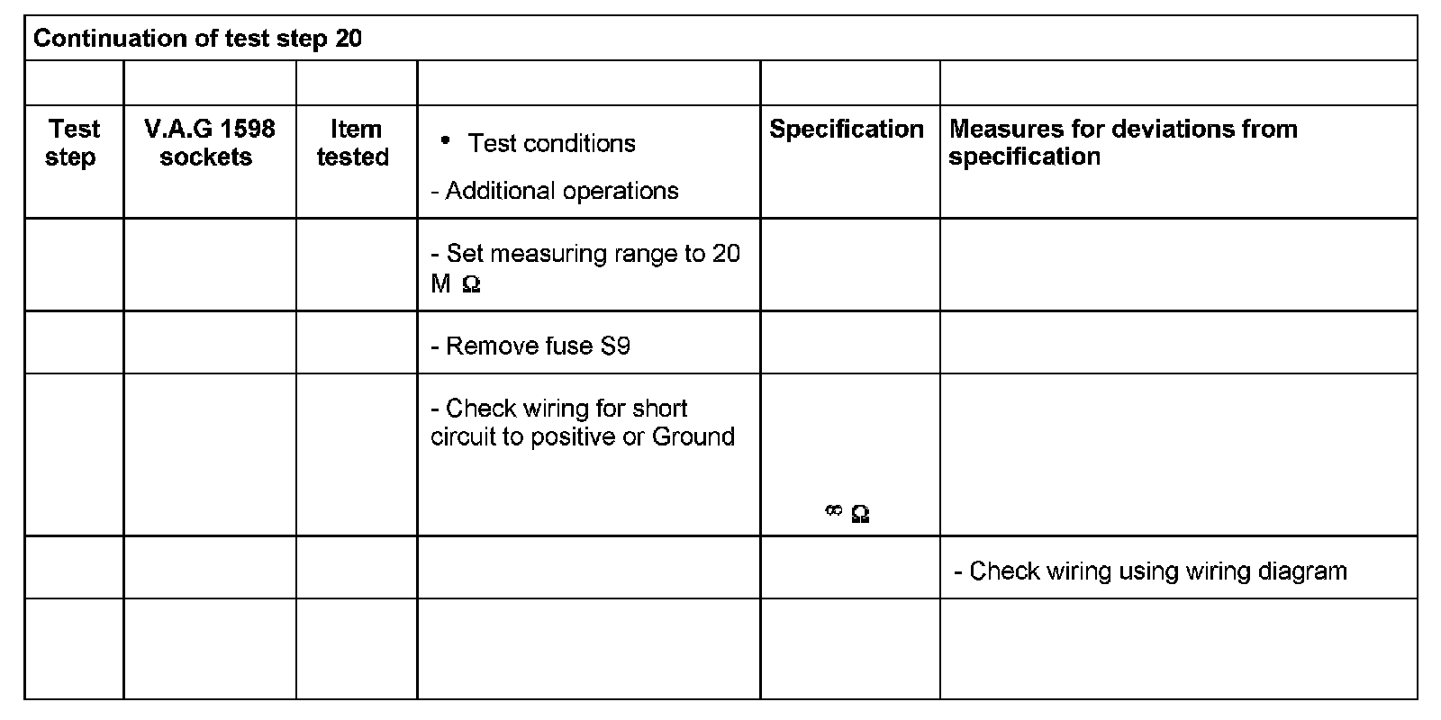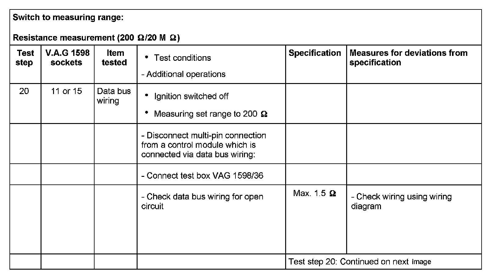 - If the measured figures only deviate slightly from the specifications, clean sockets and plugs of the testers and adapter cables (with contact spray G 000 700 04 ) and repeat check. Before replacing components, check wiring and connections and also, particularly for specifications of less than 10 ohms, repeat resistance check on the component.