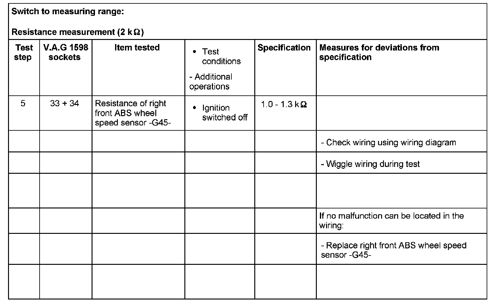 - If the readings obtained deviate from the specifications, carry out repair measure in the right-hand part of the table.