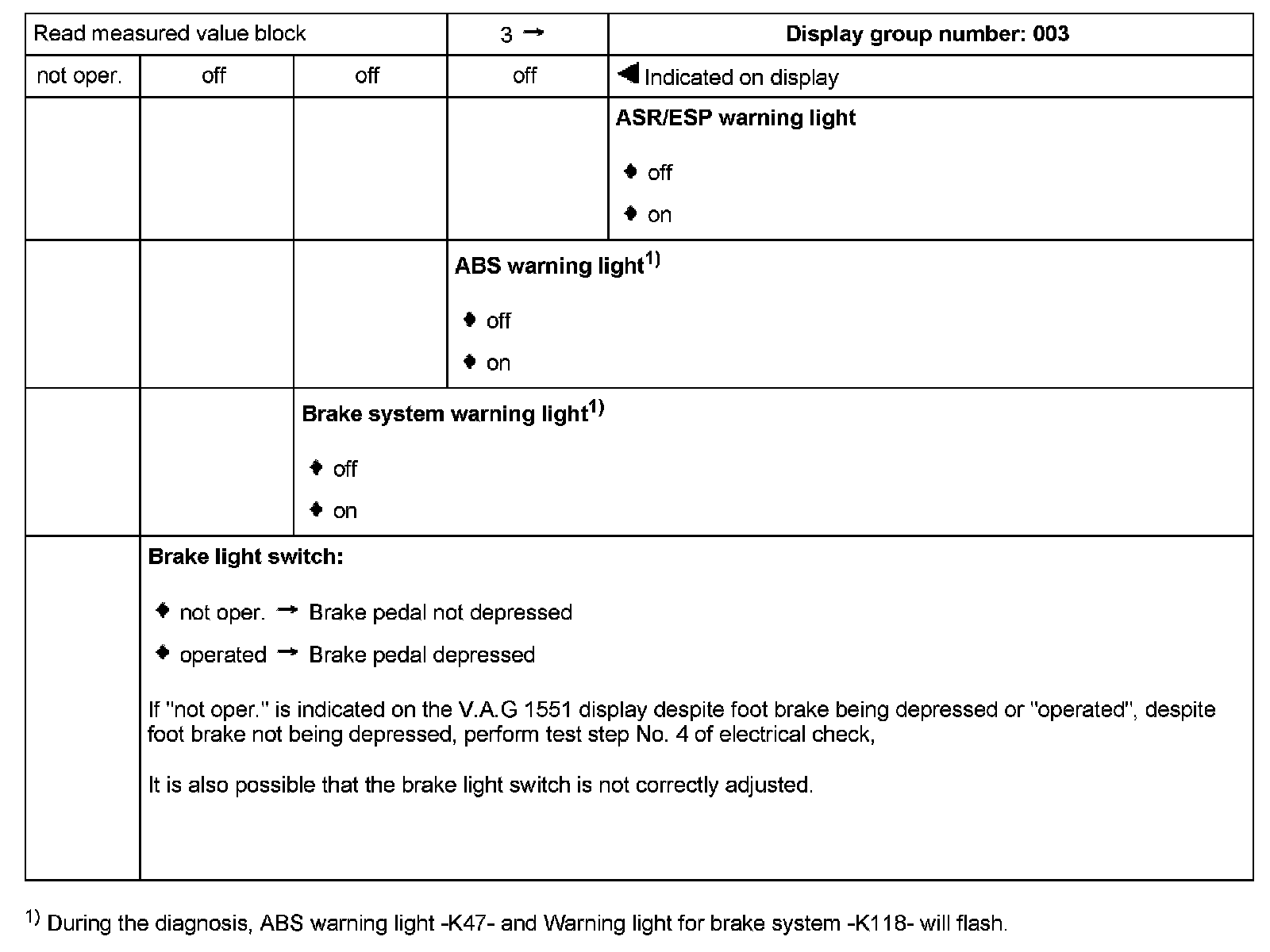 1) During the diagnosis, ABS warning light -K47- and Warning light for brake system -K118- will flash.