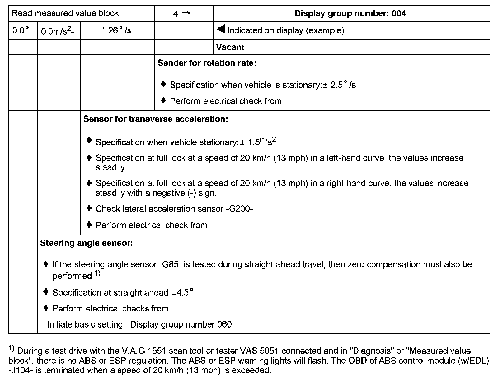 1) During a test drive with the V.A.G 1551 scan tool or tester VAS 5051 connected and in "Diagnosis" or "Measured value block", there is no ABS or ESP regulation. The ABS or ESP warning lights will flash. The OBD of ABS control module (w/EDL) -J104- is terminated when a speed of 20 km/h (13 mph) is exceeded.