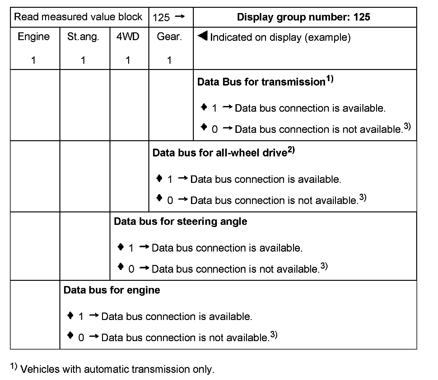 The control module can transfer a considerable amount of test data. This test data delivers information on the operational condition of the system and/or sensors connected to it. In many cases the transferred test data supports troubleshooting and repair. The test data has been summarized into single display groups because all the information cannot be evaluated at the same time. The information can be selected via display group numbers.