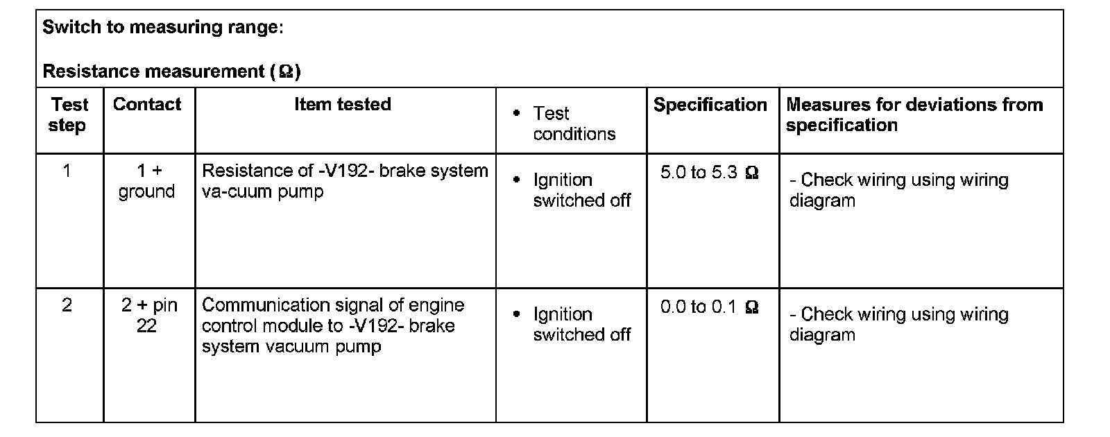 - If the readings obtained deviate from the specifications, carry out repair measure in the right-hand part of the table.