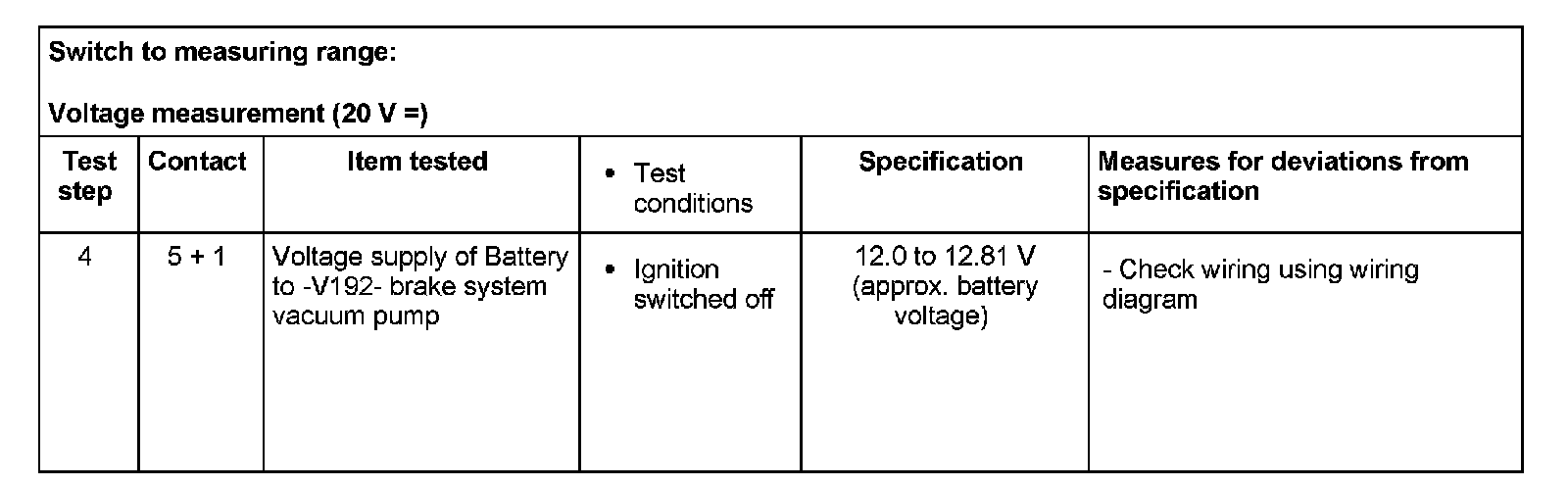 - If the readings obtained deviate from the specifications, carry out repair measure in the right-hand part of the table.