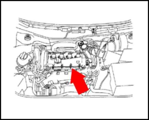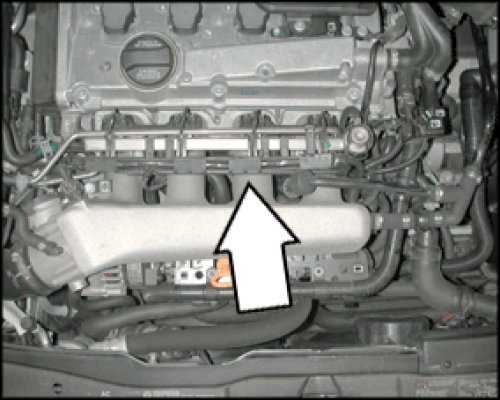 on engine, forward of valve cover under engine trim