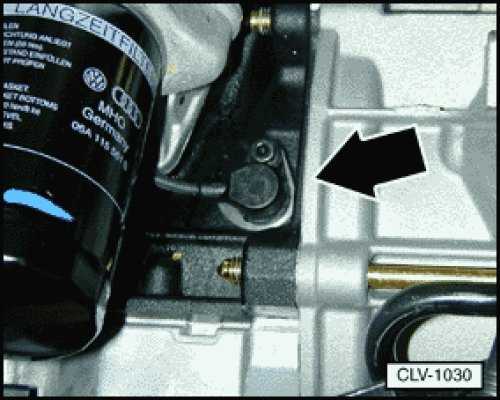 on front of engine cylinder block, lower left, near flange for transmission