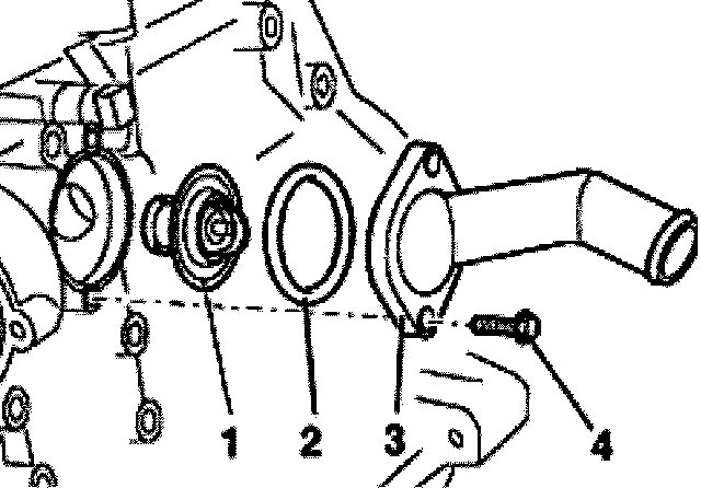 - Remove mounting bolts -4- for connecting flange -3- and remove connecting flange -3- with thermostat -1-.