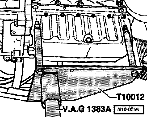 - Install engine bracket T100/12 in V.A.G 1383 A engine/transmission jack.