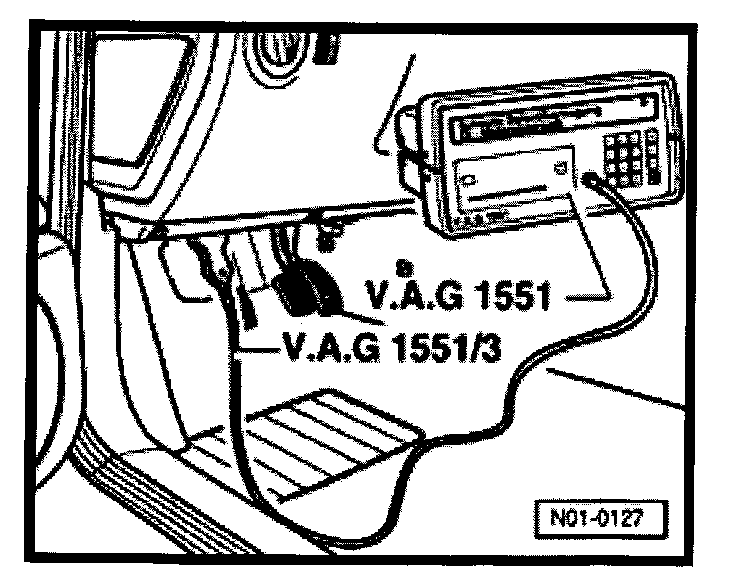- Connect VAG 1551 Scan Tool (ST) with VAG 1551/3B cable to Data Link Connector (DLC).