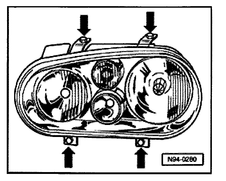 - Remove mounting screws -arrows- and pull headlight housing out slightly forward.