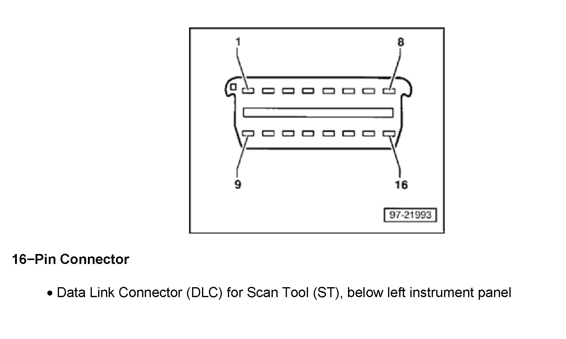 16-Pin Data Link Connector (DLC) for Scan Tool (ST), below left instrument panel
